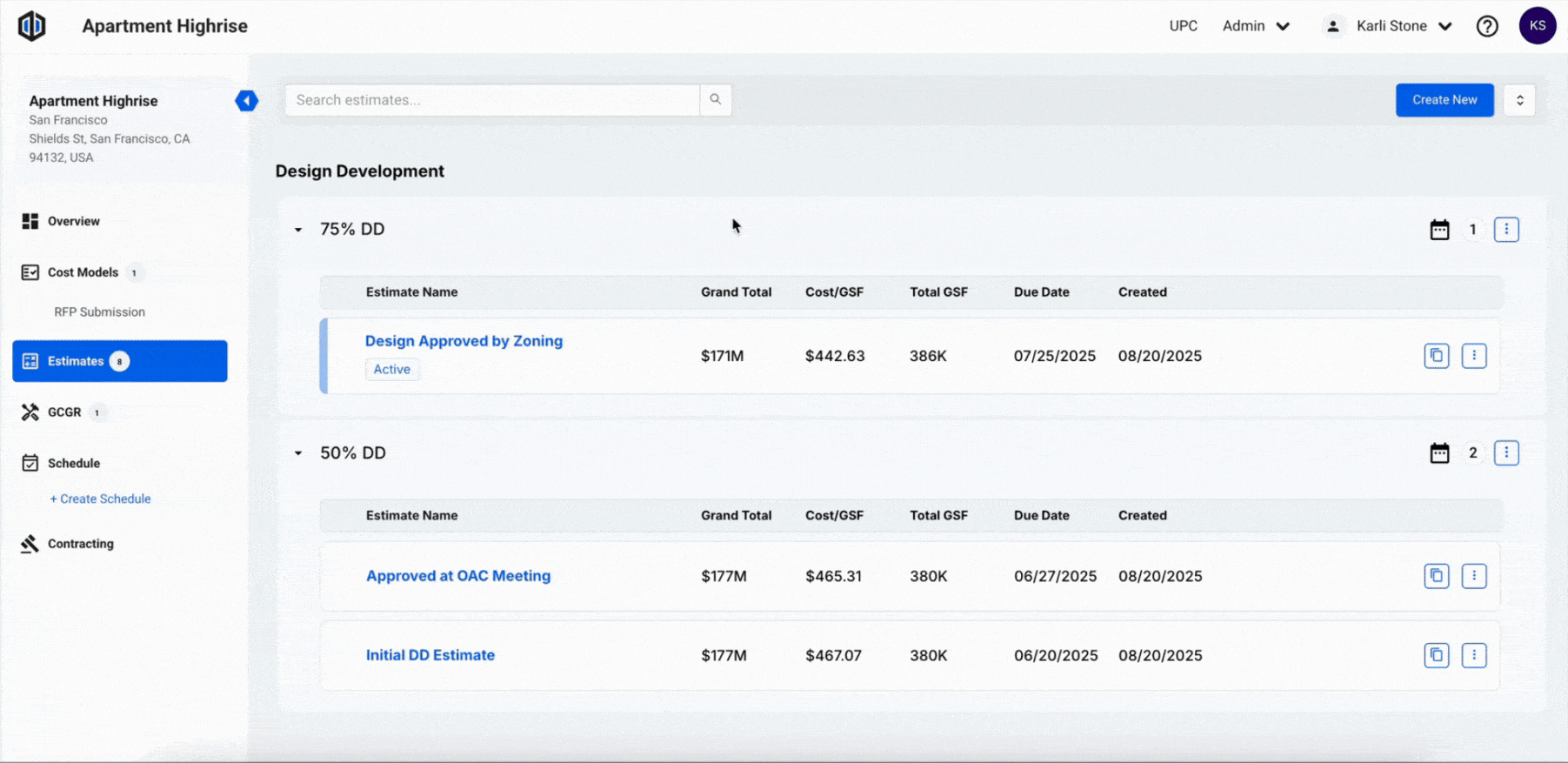 Milestones store and track estimates within each design stage (ex. Conceptual, Schematic, Design Development (DD), and Construction Documents (CD)), allowing you to tag estimates with specific milestones and locate them with ease.