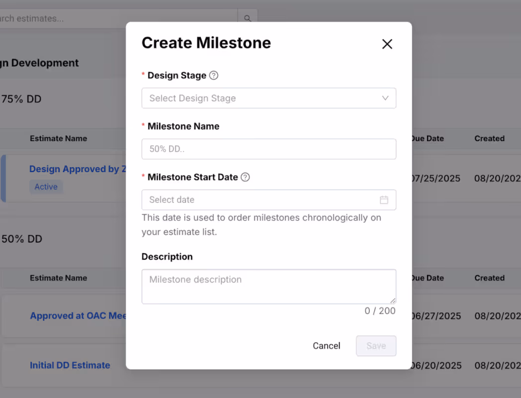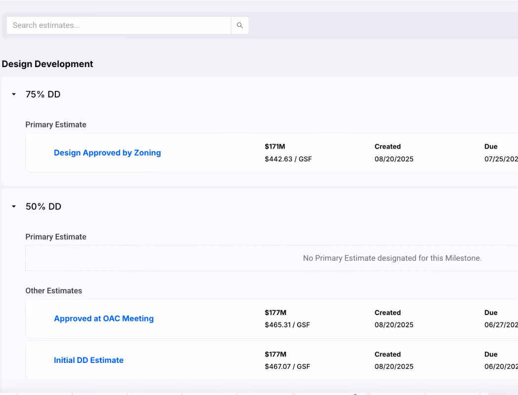Partners estimate side-by-side in one system from a shared database with version control and audit logs that keeps costs aligned through the whole planning process.